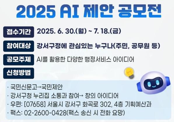 서울 강서구(구청장 진교훈)가 인공지능(AI) 기술을 활용한 행정 혁신과 주민 체감형 서비스 발굴을 위해 `2025 AI 제안 공모전`을 개최한다.