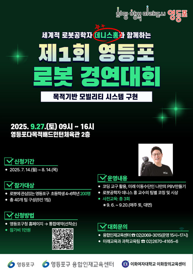 제 1회 영등포 로봇 경영대회 포스터.서울 영등포구(구청장 최호권)는 ‘목적 기반 모빌리티(PBV) 시스템 구현’을 주제로 ‘제1회 영등포 로봇 경연대회’를 오는 9월 27일 다목적 배드민턴 체육관에서 개최한다. 이번 대회는 특정 목적에 맞춘 스마트 이동 수단 로봇을 제작하는 행사로, 예를 들어 찾아가는 이동 병원이나 재난 구조 로봇 차량 등이 해당된다.