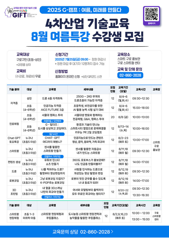구로구가 미래 인재 양성을 위해 ‘2025 G-캠프 8월 여름특강’ 수강생을 이달 25일부터 선착순 모집하며, 드론, 인공지능, 스마트팜 등 체험형 4차산업 교육을 무료로 제공한다.