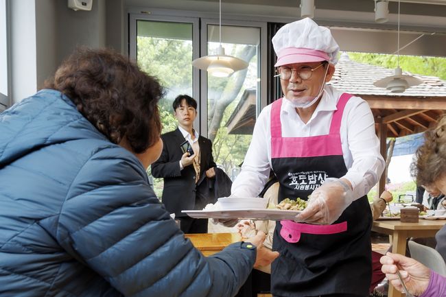 박강수 마포구청장이 효도밥상 어르신께 식사를 건네고 있다. 마포구(구청장 박강수)는 어르신 급식 사업 ‘효도밥상’에 IT비서관 대시보드와 연계한 스마트관리 체계를 도입해 출석 현황과 잔반량 등의 데이터를 실시간으로 수집·분석하고 시각화해 모니터링할 수 있는 시스템을 구축했다고 밝혔다.