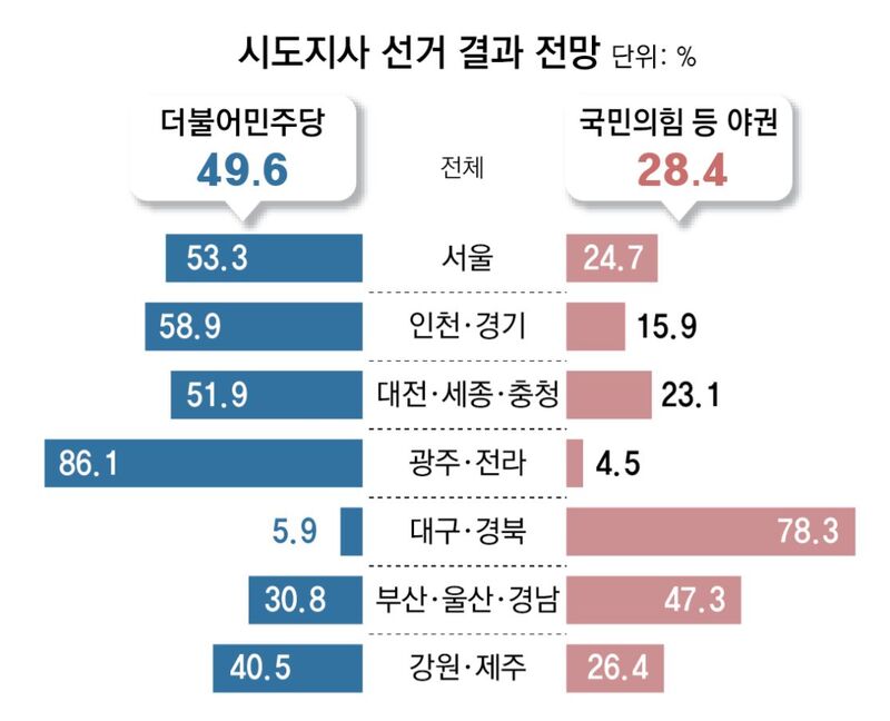 시도지사 선거 국힘 대구·경북제외 전지역 “민주당에 투표” 41.6% vs “국힘에 투표” 25.6%