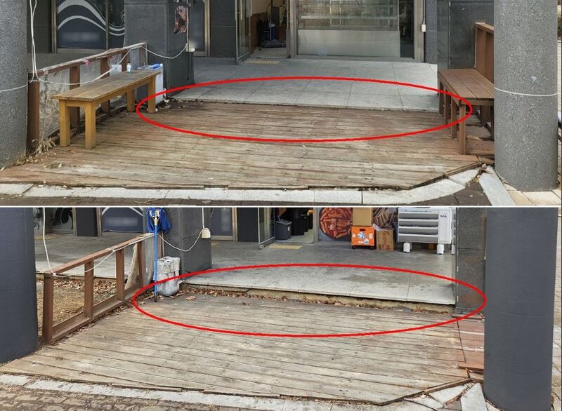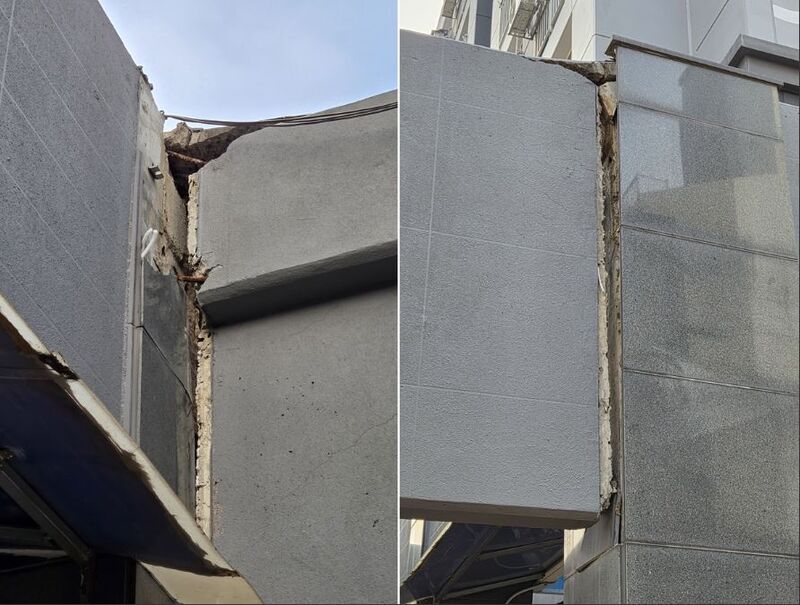 안씨의 가게 앞 구조물은 단순 균열을 넘어 틈이 발생해 콘크리트 단면과 철근이 고스란히 노출된 상태였다.