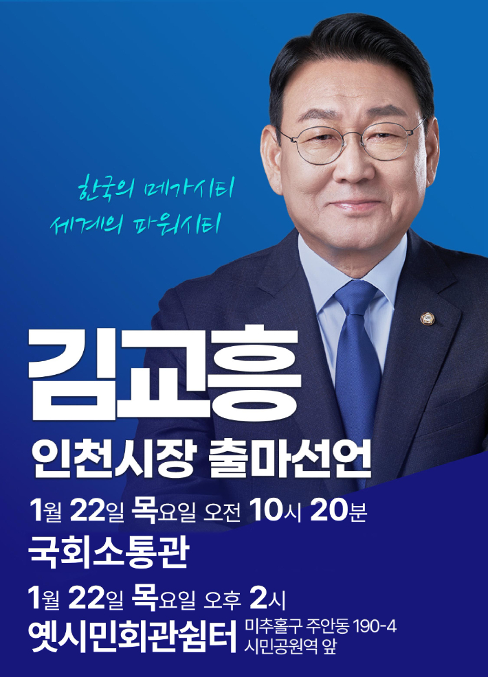 김교흥 더불어민주당 의원(인천 서갑)은 오는 22일 인천시장 선거 출마를 공식 선언할 예정이라고 밝혔다.