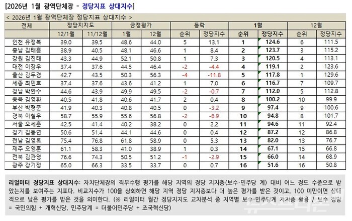 유정복 시장에 이어 김태흠 충남지사가 123.7점으로 2위를, 김진태 강원지사는 120.5점으로 3위를 차지했다. 수도권 단체장인 오세훈 서울시장은 11위(94.6점), 김동연 경기지사는 12위(87.2점)에 그쳤다.