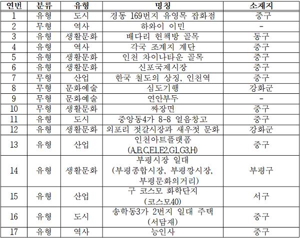 이번에 선정된 ‘인천지역유산’은 배다리 헌책방 골목, 각국 조계지 계단, 신포국제시장, 짜장면, 인천아트플랫폼 등 총 17건이다. 개항의 역사와 생활사, 산업・도시 변화의 흐름을 보여주는 기록과 공동체의 기억이 축적된 공간 등이 포함돼 시민 공감도를 높였다는 평가를 받고 있다.