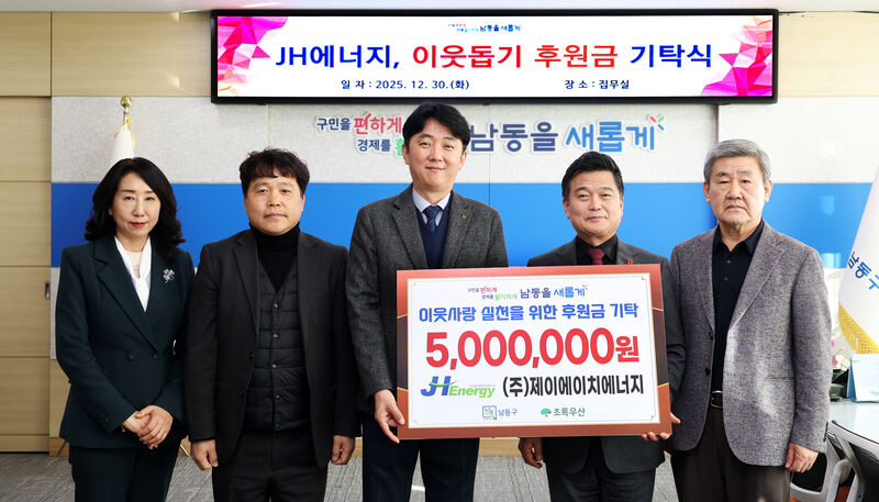 박종효 남동구청장은 “지역사회를 위한 따뜻한 나눔에 동참해 주신 ㈜JH에너지에 깊이 감사드린다.”라며, “기탁해 주신 성금은 도움이 꼭 필요한 이웃들에게 소중히 전달하겠다.”라고 말했다.