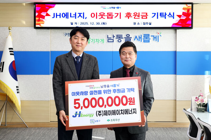 인천 남동구(구청장 박종효)는 지난 12월 30일 (화) (주)JH에너지로부터 이웃사랑 실천을 위한 후원금(5백만원)을 기탁받았다고 밝혔다.