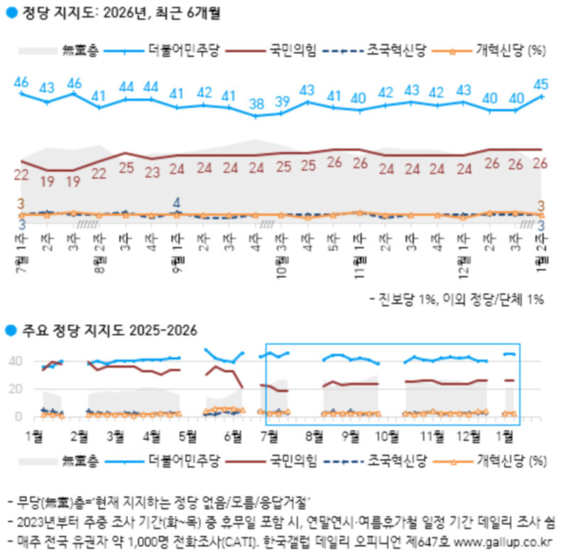 여론조사 전문기관 한국갤럽이 2026년 1월 6일∼8일 전국 만 18세 이상 유권자 1,000명에게 현재 지지하는 정당을 물은 결과 더불어민주당 45%, 국민의힘 26%, 조국혁신당 3%, 개혁신당 3%, 진보당 1%, 이외 정당 및 단체 1%로 나타났다. 지지하는 정당이 없는 무당(無黨)층은 21%로 집계됐다.