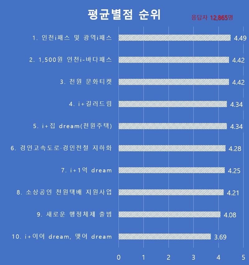 설문은 인천시가 추진 중인 10대 주요 사업에 대해 5점 만점의 별점 평가 방식으로 진행됐으며전반적으로 높은 점수를 받았다특히 교통 분야 정책이 가장 높은 평가를 받았고이어 천원 문화티켓천원주택 등 시민 체감도가 높은 천원정책에 대한 만족도가 높았다.