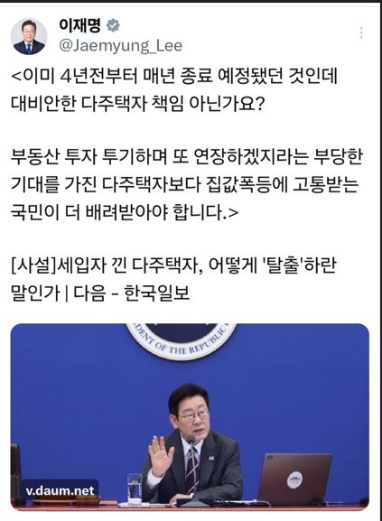 이 대통령 "다주택자보다 '집값 폭등' 고통받는 국민이 더 배려받아야" - 이 대통령은 오늘 오전 엑스(X·옛 트위터)에 올린 글에서 토지거래허가구역 내에 세입자가 거주 중인 다주택자는 양도세 중과 유예 종료일인 오는 5월 9일까지 처분하기 어렵다고 지적한 언론…