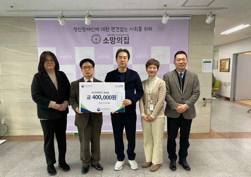서인천세무서(서장 임식용)는 설 명절을 앞두고 인천시 서구 소재 정신요양시설 소망의집(원장 김현창)을 찾아 후원금을 전달하며 지역사회 나눔을 실천했다.