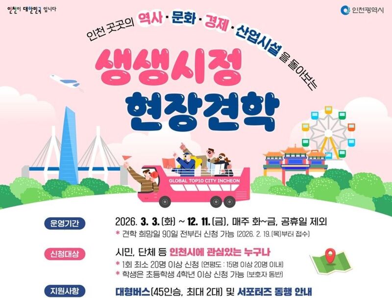 다만, 제9회 전국동시지방선거에 따른 공직선거법 규정에 따라 선거일 60일 전인 4월 4일부터 6월 3일까지는 현장견학 운영이 일시 중단된다. 인천시는 중단 기간 전후 신청 수요가 집중될 것에 대비해 사전 안내와 신청 관리에 만전을 기할 계획이다.